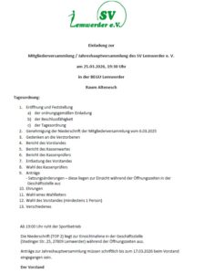 Der SVL lädt ein zur Jahreshauptversammlung am 25.03.2026 in der BEGU Lemwerder. Wir freuen uns auf rege Teilnahme!